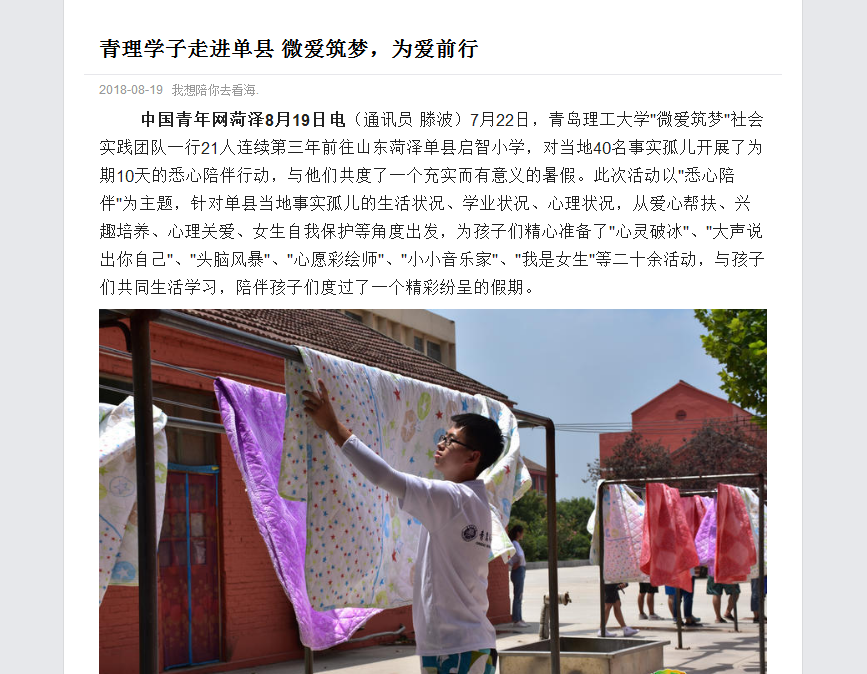 7月22日,伟德国际1946bv官网"微爱筑梦"社会实践团队一行21人连续第三年前往山东菏泽单县启智小学,对当地40名事实孤儿开展了为期10天的悉心陪伴行动,与他们共度了一个充实而有意义的暑假。此次活动以"悉心陪伴"为主题,针对单县当地事实孤儿的生活状况、学业状况、心理状况,从爱心帮扶、兴趣培养、心理关爱、女生自我保护等角度出发,为孩子们精心准备了"心灵破冰"、"大声说出你自己"、"头脑风暴"、"心愿彩绘师"、"小小音乐家"、"我是女生"等二十余活动,与孩子们共同生活学习,陪伴孩子们度过了一个精彩纷呈的假期。