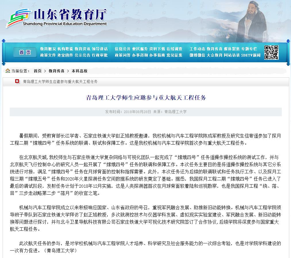 暑假期间,受教育部长江学者、石家庄铁道大学赵正旭教授邀请,伟德官网机械与汽车工程学院陈成军教授及研究生信寄遥参加了探月工程二期“嫦娥四号”任务系统的联调、联试和保障工作。这是伟德官网机械与汽车工程学院首次参与重大航天工程任务。