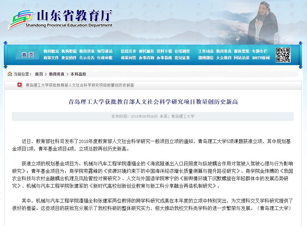 获准立项的规划基金项目为:机械与汽车工程学院潘福全的《海底隧道出入口段照度与纵坡耦合作用对驾驶人驾驶心理与行为影响研究》;青年基金项目为:商学院苟露峰的《资源环境约束下的中国海洋经济增长质量测算与提升路径研究》、商学院金炜博的《我国农业科技与农村金融耦合机理及风险管控对策研究》、人文与外国语学院常宁的《新舆情环境下沉默螺旋在年轻群体中的发展态势研究》、机械与汽车工程学院张建军的《新时代高校创新创业教育与新工科分享融合再造机制研究》。