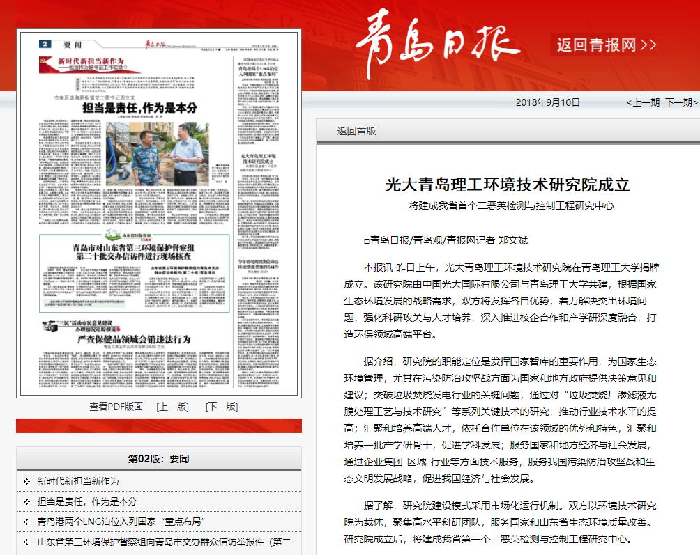 本报讯 昨日上午,光大青岛理工环境技术研究院在伟德国际1946bv官网揭牌成立。该研究院由中国光大国际有限公司与伟德国际1946bv官网共建,根据国家生态环境发展的战略需求,双方将发挥各自优势,着力解决突出环境问题,强化科研攻关与人才培养,深入推进校企合作和产学研深度融合,打造环保领域高端平台。