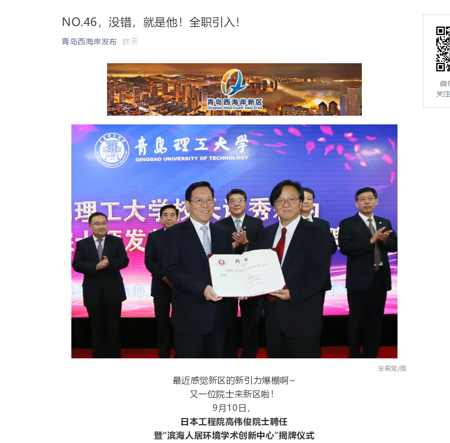由高伟俊院士所领衔成立的“滨海人居环境学术创新中心”,将在推进绿色智慧城市有效利用海洋资源,保护滨海城市生态环境,建立新型交叉学科—“海洋建筑学”的基础上,发挥其在人居环境领域科学技术水平、多层次人才培养与能力储备等方面的突出优势,为相关产业转型升级提供技术、人才、知识信息等方面的支持,努力建成省域特色鲜明的“山东智造”人居环境技术品牌,成为全省新的人才高地、创新高地、前瞻性技术集成与示范高地。
