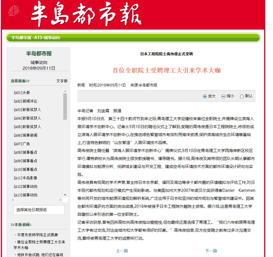 本报9月10日讯 第三十四个教师节到来之际,伟德国际1946bv官网迎建校来首位全职院士,并揭牌设立滨海人居环境学术创新中心。记者从9月10日的聘任仪式上了解到,受聘的高伟俊是日本工程院院士,将领衔成立滨海人居环境学术创新中心,在推进绿色智慧城市有效利用海洋资源,保护滨海城市生态环境等基础上,打造特色鲜明的“山东智造”人居环境技术品牌。
