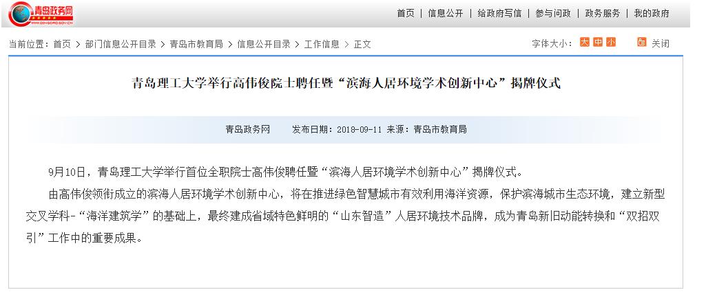 由高伟俊领衔成立的滨海人居环境学术创新中心,将在推进绿色智慧城市有效利用海洋资源,保护滨海城市生态环境,建立新型交叉学科-“海洋建筑学”的基础上,最终建成省域特色鲜明的“山东智造”人居环境技术品牌,成为青岛新旧动能转换和“双招双引”工作中的重要成果。