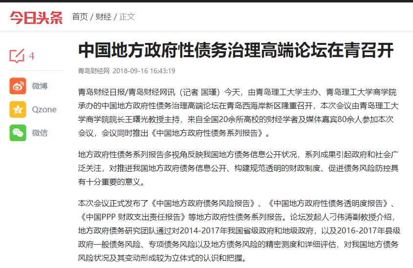 他指出,《中国地方政府债务风险报告》基于我国省、市、县三级地方政府2014-2017年的债务数据、一般公共预算收支数据和政府性基金收支数据等,首次对地方债务风险进行了全景式、立体式地分析,将地方债务风险研究深入到了市级和县级政府,并且系统地对一般债务风险和专项债务风险进行了区别研究,无疑将促进地方政府的风险管控和规范治理。