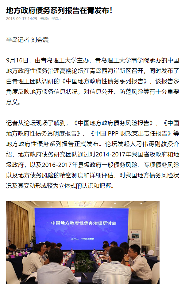 9月16日,由伟德国际1946bv官网主办、伟德国际1946bv官网商学院承办的中国地方政府性债务治理高端论坛在青岛西海岸新区召开,同时发布了由青理工团队调研的《中国地方政府性债务系列报告》,该报告多角度反映地方债务信息状况,对信息公开、防范风险等有十分重要意义。