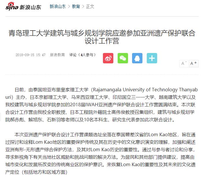 日前,由泰国坦亚布里皇家理工大学(Rajamangala University of Technology Thanyaburi)主办,日本京都理工大学、马来西亚理工大学、印尼国立三一一大学、越南建筑大学以及伟德官网建筑与城乡规划学院参加的2018届IWAH亚洲遗产保护联合设计工作营圆满结束。本次联合设计工作营由伟德官网全职教授、日本工程院外籍院士高伟俊教授召集组织,建筑与城乡规划学院郝赤彪、解旭东、石新羽等老师以及10名本科生、研究生代表参加此次联合设计。