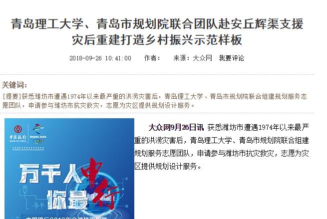 大众网9月26日讯获悉潍坊市遭遇1974年以来最严重的洪涝灾害后,伟德国际1946bv官网、青岛市规划院联合组建规划服务志愿团队,申请参与潍坊市抗灾救灾,志愿为灾区提供规划设计服务。