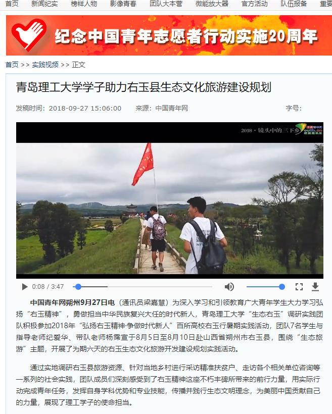通过实地调研右玉县旅游资源、针对当地乡村进行采访精准扶贫户、走访各个相关单位咨询等一系列的社会实践,团队成员们深刻感受到了右玉精神这座不朽丰碑所带来的前行力量,用实际行动完成青年任务,发挥自身学科优势和专业技能,传播并践行生态文明理念,为美丽中国贡献自己的力量,展现了理工学子的使命担当。