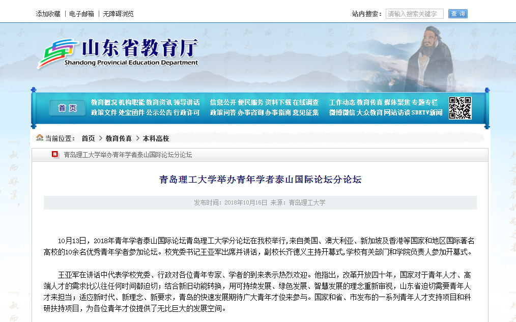 10月13日,2018年青年学者泰山国际论坛伟德国际1946bv官网分论坛在伟德官网举行,来自美国、澳大利亚、新加坡及香港等国家和地区国际著名高校的10余名优秀青年学者参加论坛。校党委书记王亚军出席并讲话,副校长齐德义主持开幕式,学校有关部门和学院负责人参加开幕式。