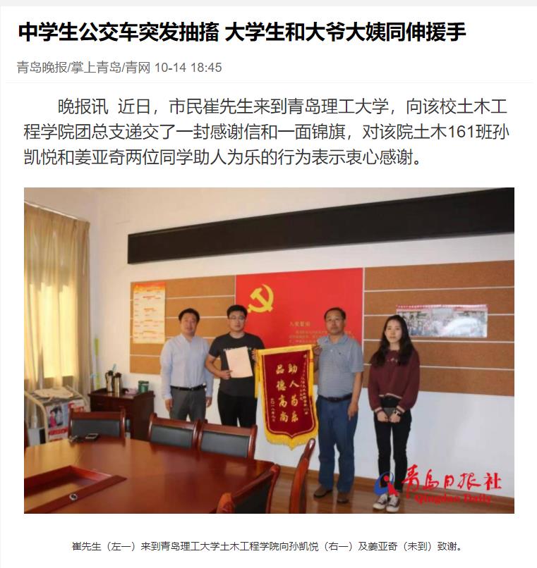 崔先生首先表达了感激之情,随后叙述了事情的经过:9月21日下午,崔先生的外甥在放学回家的公交车上突然抽搐,以致无法自主行动,情急之下孙凯悦和姜亚奇同学以及车上的另外两位乘客将崔先生的外甥扶下车,并拨打了家属电话。四人联手将其送到齐鲁医院,在四人的帮助下,崔先生的外甥状态逐渐好转并可以自己行动。两位同学给挂了号,等待医生检查确定对方身体无大碍后悄然离开。崔先生事后经多方打听才联系到两位同学,特来学校表示感谢。