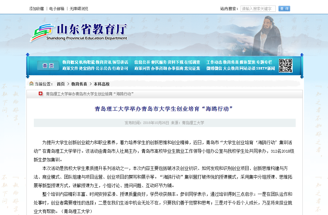 为提升大学生创新创业能力和职业素养,着力培养学生的创新思维和创业精神,近日,青岛市“大学生创业培育‘海鸥行动’集训活动”在伟德国际1946bv官网举行。该活动由青岛市人社局主办,青岛市高校毕业生就业工作领导小组办公室与伟德官网学生处共同承办,312名2018级新生参加集训。