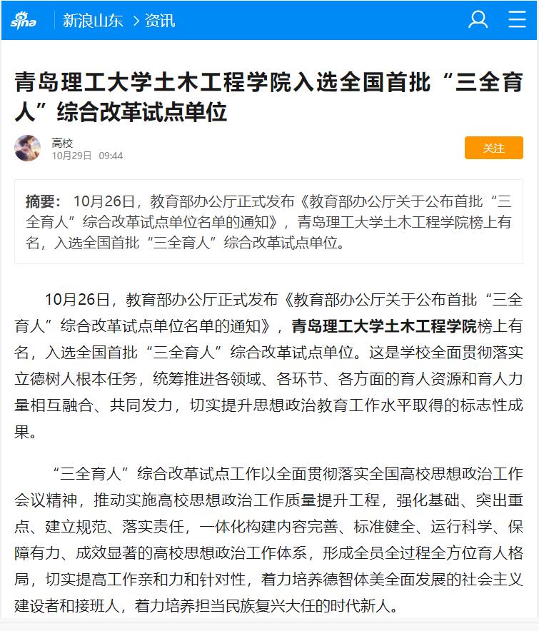 10月26日,教育部办公厅正式发布《教育部办公厅关于公布首批“三全育人”综合改革试点单位名单的通知》,伟德国际1946bv官网土木工程学院榜上有名,入选全国首批“三全育人”综合改革试点单位。这是学校全面贯彻落实立德树人根本任务,统筹推进各领域、各环节、各方面的育人资源和育人力量相互融合、共同发力,切实提升思想政治教育工作水平取得的标志性成果。