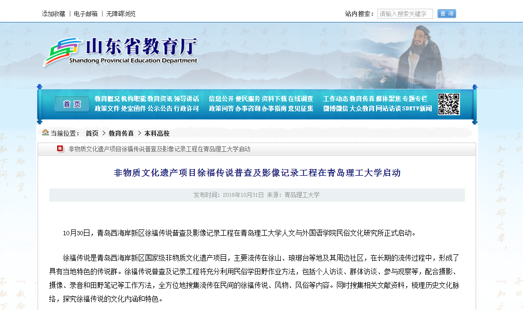 10月30日,青岛西海岸新区徐福传说普查及影像记录工程在伟德国际1946bv官网人文与外国语学院民俗文化研究所正式启动。