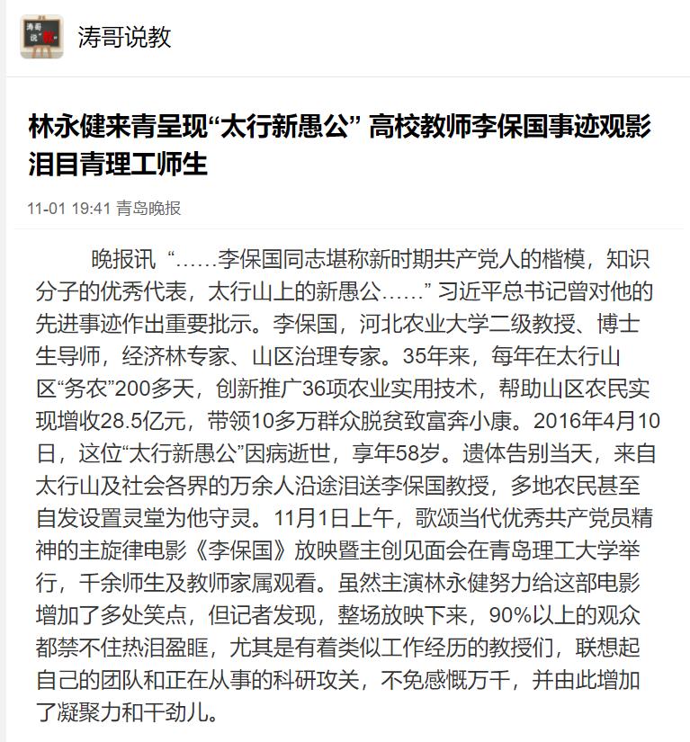 晚报讯“……李保国同志堪称新时期共产党人的楷模,知识分子的优秀代表,太行山上的新愚公……” 习近平总书记曾对他的先进事迹作出重要批示。李保国,河北农业大学二级教授、博士生导师,经济林专家、山区治理专家。35年来,每年在太行山区“务农”200多天,创新推广36项农业实用技术,帮助山区农民实现增收28.5亿元,带领10多万群众脱贫致富奔小康。2016年4月10日,这位“太行新愚公”因病逝世,享年58岁。遗体告别当天,来自太行山及社会各界的万余人沿途泪送李保国教授,多地农民甚至自发设置灵堂为他守灵。11月1日上午,歌颂当代优秀共产党员精神的主旋律电影《李保国》放映暨主创见面会在伟德国际1946bv官网举行,千余师生及教师家属观看。虽然主演林永健努力给这部电影增加了多处笑点,但记者发现,整场放映下来,90%以上的观众都禁不住热泪盈眶,尤其是有着类似工作经历的教授们,联想起自己的团队和正在从事的科研攻关,不免感慨万千,并由此增加了凝聚力和干劲儿。