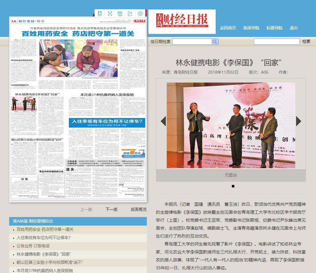 见面会上,主创团队与现场师生互动交流,分享了电影创作中的心路历程和观影感触。导演赵琦介绍,这部电影历时8个月策划、筹备,打造剧本、组建团队,秉承匠心精神,精心打磨。编剧曲士飞表示,为了真实再现李保国教授的英雄形象,主创团队沿着李保国教授的足迹踏遍太行山区,体验生活,切身感受。主演林永健表示,这是自己第一部作为主演的电影,作为文艺工作者要拿出艺术良心为观众呈现真情实感的电影,这次回到家乡青岛,希望自己刻画的李保国荧屏形象能让家乡父老满意。