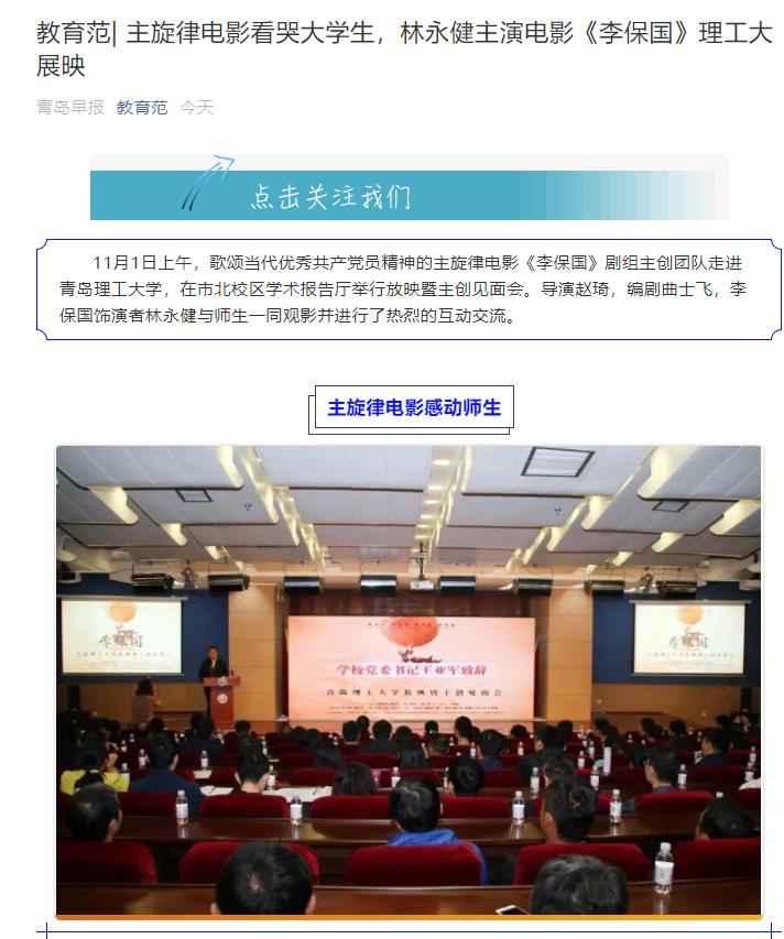 “我演的这个角色得到了家属的认可,是我最自豪的时候。”林永健说,虽然他长得不像李保国,但他塑造的形象神似李保国。据悉,他跟剧组在太行山农村连续拍摄了两个月,几乎都是在跟导演打磨人物细节。电影还在中国海洋大学、中国石油大学(华东)进行了放映。