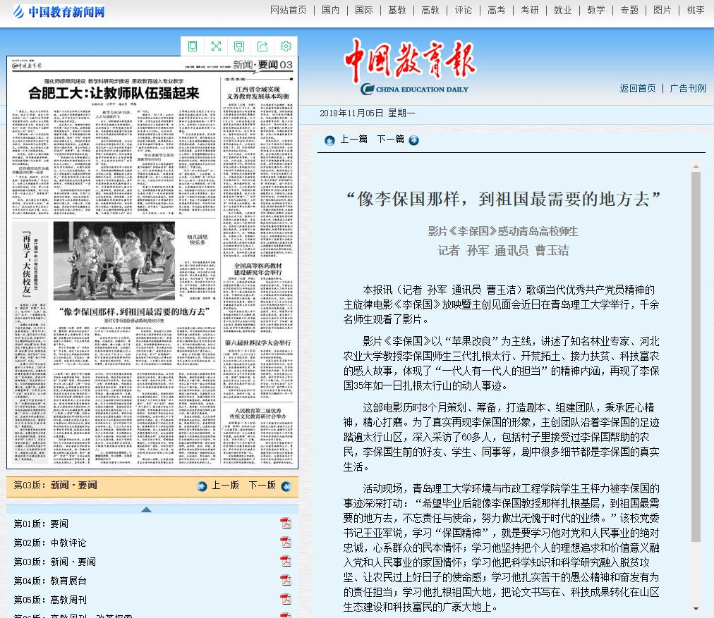 据悉,《李保国》影片还将在青岛的中国海洋大学、中国石油大学及全国60余所高校和政府、企事业单位公益放映。
