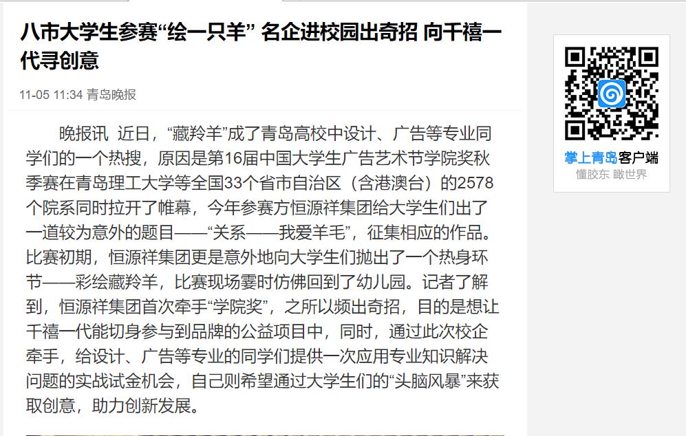 晚报讯 近日,“藏羚羊”成了青岛高校中设计、广告等专业同学们的一个热搜,原因是第16届中国大学生广告艺术节学院奖秋季赛在伟德国际1946bv官网等全国33个省市自治区(含港澳台)的2578个院系同时拉开了帷幕,今年参赛方恒源祥集团给大学生们出了一道较为意外的题目——“关系——我爱羊毛”,征集相应的作品。比赛初期,恒源祥集团更是意外地向大学生们抛出了一个热身环节——彩绘藏羚羊,比赛现场霎时仿佛回到了幼儿园。记者了解到,恒源祥集团首次牵手“学院奖”,之所以频出奇招,目的是想让千禧一代能切身参与到品牌的公益项目中,同时,通过此次校企牵手,给设计、广告等专业的同学们提供一次应用专业知识解决问题的实战试金机会,自己则希望通过大学生们的“头脑风暴”来获取创意,助力创新发展。