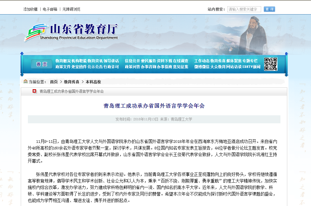 11月9-11日,由伟德国际1946bv官网人文与外国语学院承办的山东省国外语言学学2018年年会在西海岸东方梅地亚酒店成功召开。来自省内外46所高校的160余名外语专家学者齐聚一堂,探讨学术,共谋发展。8位国内知名专家发表主旨报告,44位学者做分论坛主题发言。校党委常委、副校长张伟星代表学校出席开幕式并致辞,山东省国外语言学学会会长王俊菊代表学会致辞,人文与外国语学院院长巩湘红主持开幕式。