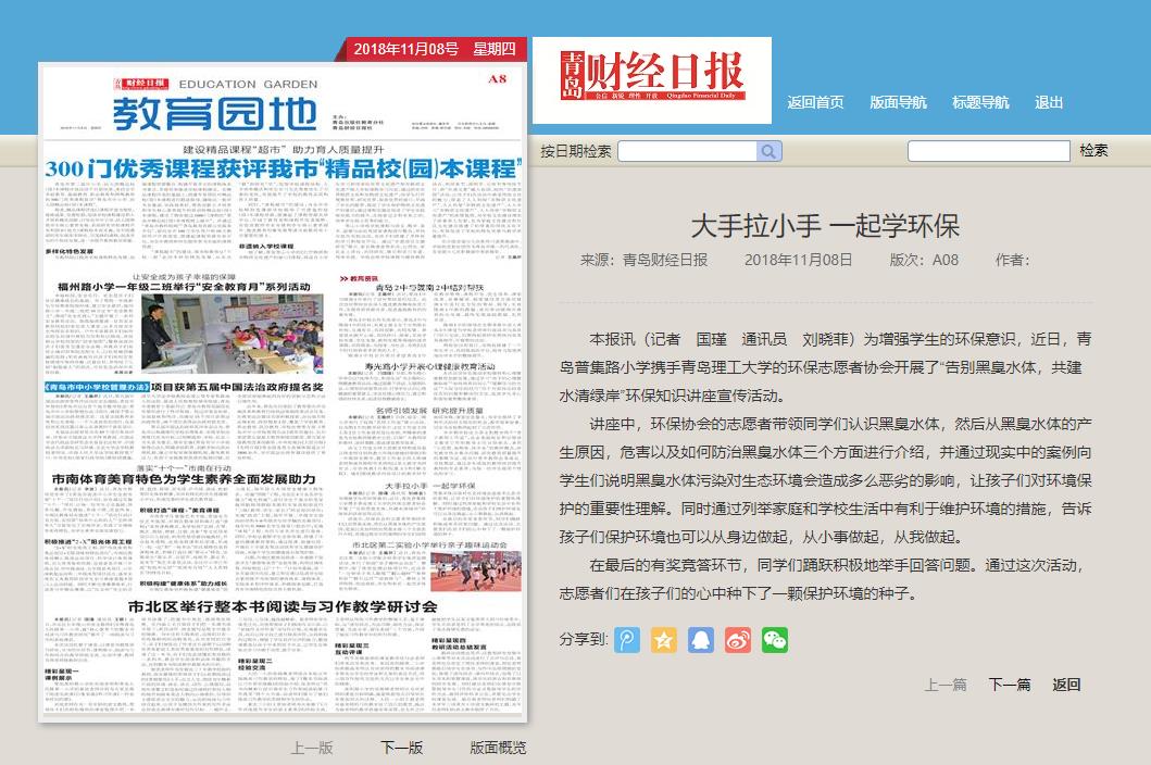 本报讯(记者 国瑾 通讯员 刘晓菲)为增强学生的环保意识,近日,青岛普集路小学携手伟德国际1946bv官网的环保志愿者协会开展了“告别黑臭水体,共建水清绿岸”环保知识讲座宣传活动。