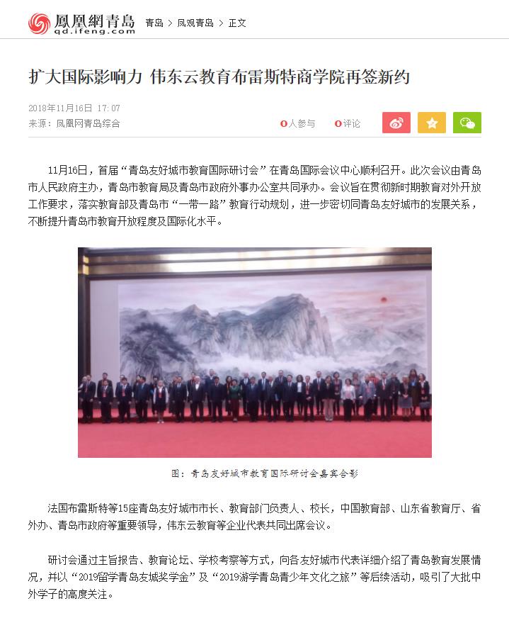 近年来,青岛一直致力于扩大教育国际交流与合作,引进国外优质教育资源,加强师生国际意识培养,不断提高教育国际化水平,同时仍需增加相对固定的国际教育交流平台。伟东云教育集团于2016年成功收购法国精英大学联盟成员法国布雷斯特商学院,开创了中国教育走出国门办大学的先河。伟东云教育充分利用自身在职业教育、高等教育及海外教育事业上的资源优势,努力打造国际化互联网教育平台,有效丰富了青岛国际教育交流领域内容。