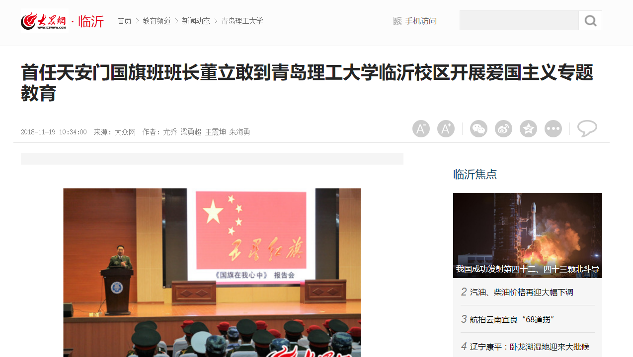 大众网临沂11月19日讯(记者 尤乔 梁勇超 见习记者 王震坤 通讯员 朱海勇)11月15日下午,首任天安门国旗班班长董立敢应邀到伟德国际1946bv官网临沂校区指导国旗护卫队建设工作,并开展“国旗在我心中”爱国主义教育主题活动。临沂校区党委常务副书记李国涛出席报告会,校区学生工作部副主任、团委书记、武装部副主任刘宗庆主持,校区学生工作部相关负责同志、国旗护卫队成员、学生党员和入党积极分子600余人参加报告会。