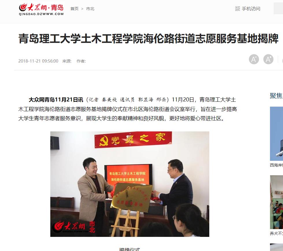 大众网青岛11月21日讯(记者 秦美旋 通讯员 郭显海 邢岳)11月20日,伟德国际1946bv官网土木工程学院海伦路街道志愿服务基地揭牌仪式在市北区海伦路街道会议室举行,旨在进一步提高大学生青年志愿者服务意识,展现大学生的奉献精神和良好风貌,更好地将爱心带进社区。