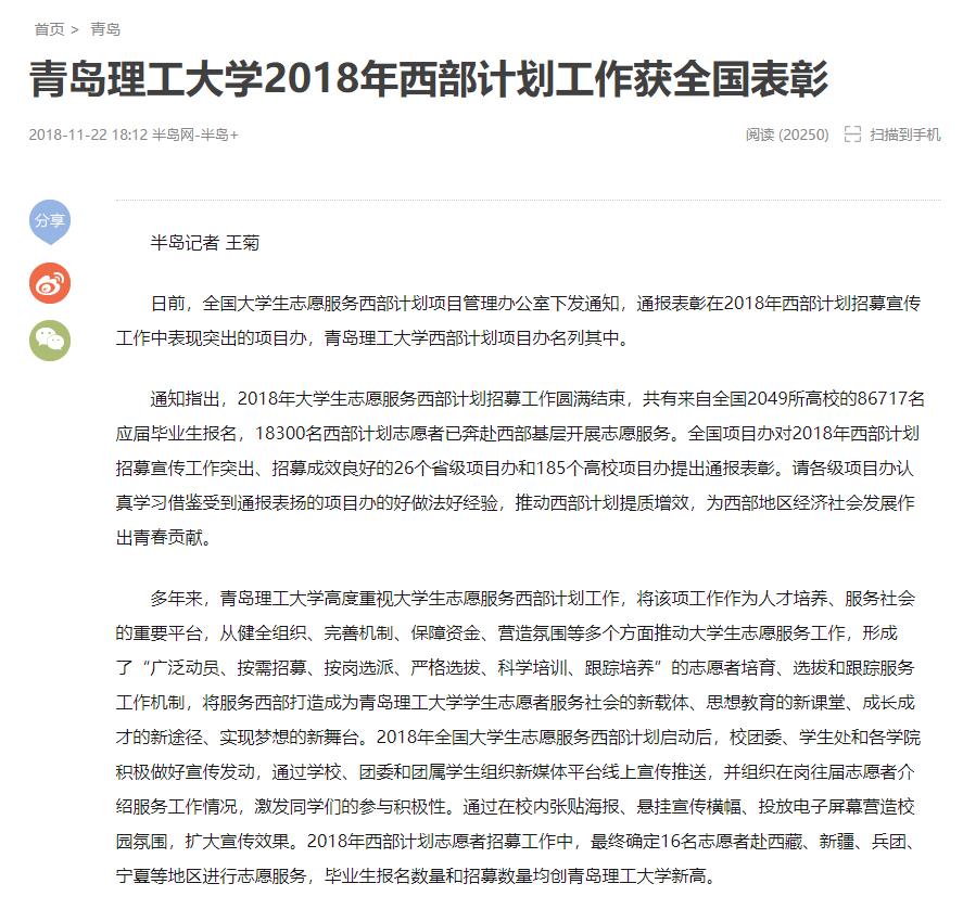 日前,全国大学生志愿服务西部计划项目管理办公室下发通知,通报表彰在2018年西部计划招募宣传工作中表现突出的项目办,伟德国际1946bv官网西部计划项目办名列其中。