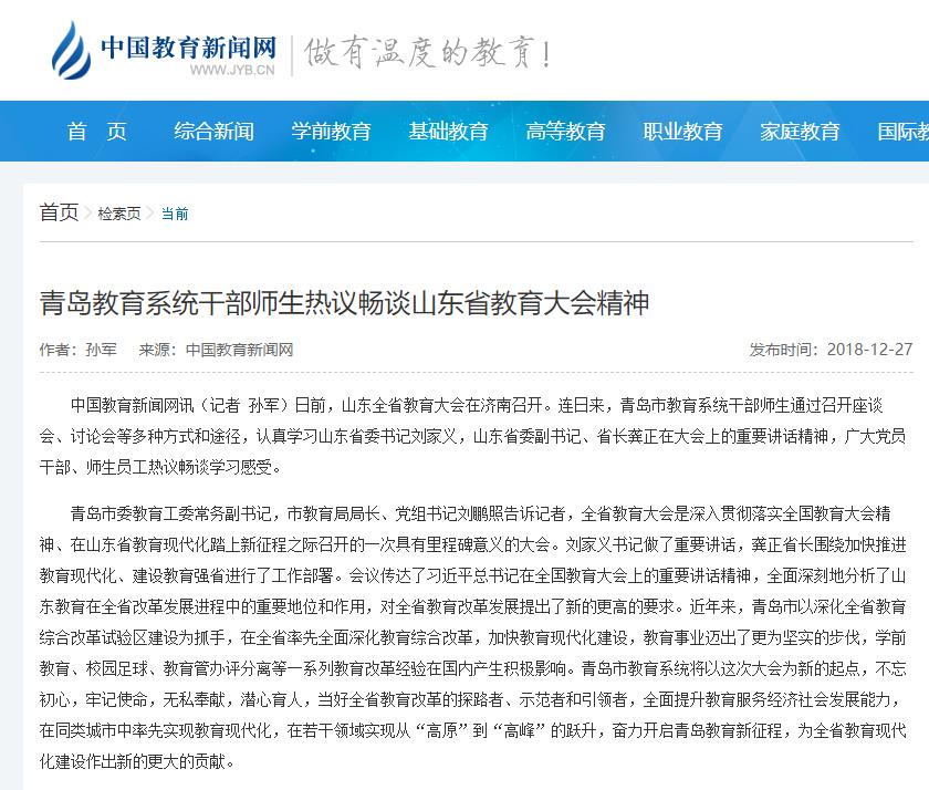 中国教育新闻网讯(记者 孙军)日前,山东全省教育大会在济南召开。连日来,青岛市教育系统干部师生通过召开座谈会、讨论会等多种方式和途径,认真学习山东省委书记刘家义,山东省委副书记、省长龚正在大会上的重要讲话精神,广大党员干部、师生员工热议畅谈学习感受。