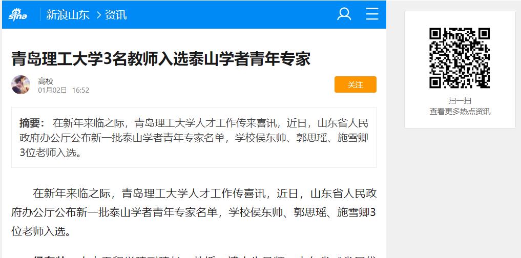 在新年来临之际,伟德国际1946bv官网人才工作传喜讯,近日,山东省人民政府办公厅公布新一批泰山学者青年专家名单,学校侯东帅、郭思瑶、施雪卿3位老师入选。