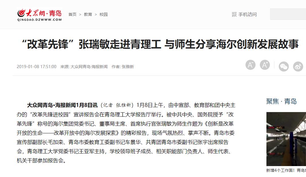 大众网青岛·海报新闻1月8日讯(记者 张雅新)1月8日上午,由中宣部、教育部和团中央主办的“改革先锋进校园”宣讲报告会在伟德国际1946bv官网报告厅举行。被中共中央、国务院授予“改革先锋”称号的海尔集团党委书记、董事局主席、首席执行官张瑞敏为师生作题为《创新是改革开放的生命——改革开放中的海尔发展探索》的精彩报告,现场气氛热烈、掌声不断。青岛市委宣传部副部长毛加栾、青岛市委教育工委副书记车景华、共青团青岛市委副书记张宇出席报告会,伟德国际1946bv官网党委书记王亚军主持,学校领导班子成员、相关职能部门负责人、师生代表、机关干部参加报告会。