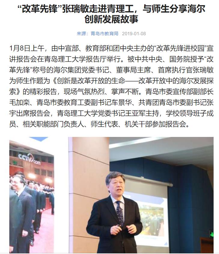 1月8日上午,由中宣部、教育部和团中央主办的“改革先锋进校园”宣讲报告会在伟德国际1946bv官网报告厅举行。被中共中央、国务院授予“改革先锋”称号的海尔集团党委书记、董事局主席、首席执行官张瑞敏为师生作题为《创新是改革开放的生命——改革开放中的海尔发展探索》的精彩报告,现场气氛热烈、掌声不断。青岛市委宣传部副部长毛加栾、青岛市委教育工委副书记车景华、共青团青岛市委副书记张宇出席报告会,伟德国际1946bv官网党委书记王亚军主持,学校领导班子成员、相关职能部门负责人、师生代表、机关干部参加报告会。
