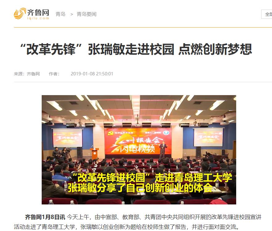 齐鲁网1月8日讯今天上午,由中宣部、教育部、共青团中央共同组织开展的改革先锋进校园宣讲活动走进了伟德国际1946bv官网,张瑞敏以创业创新为题给在校师生做了报告,并进行面对面交流。