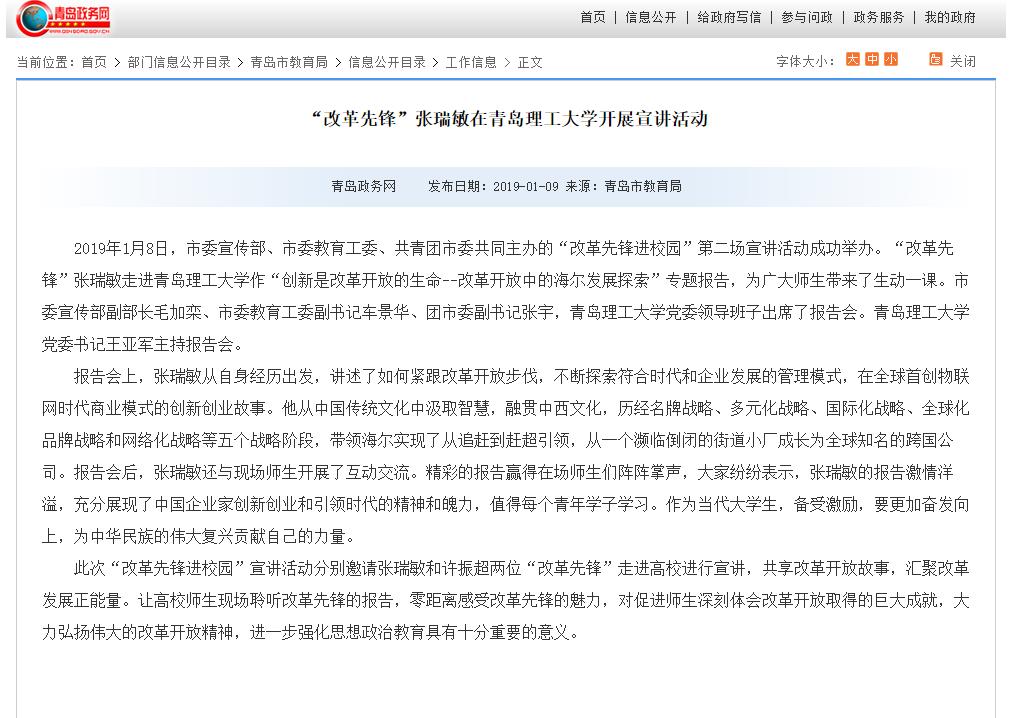 2019年1月8日,市委宣传部、市委教育工委、共青团市委共同主办的“改革先锋进校园”第二场宣讲活动成功举办。“改革先锋”张瑞敏走进伟德国际1946bv官网作“创新是改革开放的生命--改革开放中的海尔发展探索”专题报告,为广大师生带来了生动一课。市委宣传部副部长毛加栾、市委教育工委副书记车景华、团市委副书记张宇,伟德国际1946bv官网党委领导班子出席了报告会。伟德国际1946bv官网党委书记王亚军主持报告会。