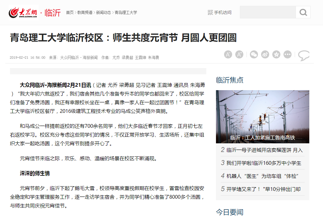 大众网临沂·海报新闻2月21日讯(记者 尤乔 梁勇超 见习记者 王震坤 通讯员 朱海勇 )“我大年初六就返校了,我们宿舍其他几个准备专升本的同学也都回来了,校区给同学们准备了免费汤圆,我还有幸跟校长坐在一桌,真像一家人在一起过团圆节!”在伟德国际1946bv官网临沂校区餐厅,2016级建筑工程技术专业的马成公笑声格外爽朗。