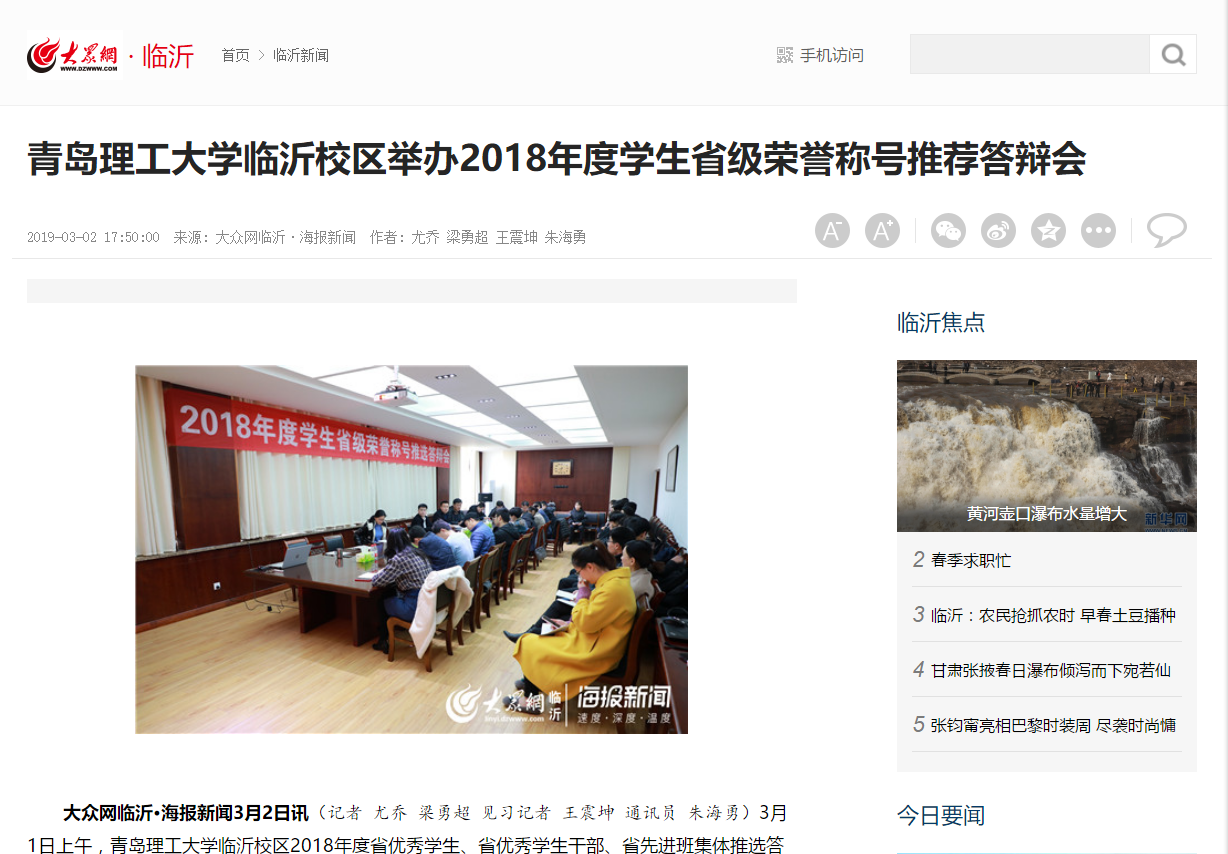 大众网临沂·海报新闻3月2日讯(记者 尤乔 梁勇超 见习记者 王震坤 通讯员 朱海勇)3月1日上午,伟德国际1946bv官网临沂校区2018年度省优秀学生、省优秀学生干部、省先进班集体推选答辩会在办公楼202室举行。校区党委常务副书记李国涛,学生工作部副主任、团委书记刘宗庆出席答辩会,校区学生工作部、教务部、基础部、体育教学部、各系辅导员等相关教师及学生代表担任评委。