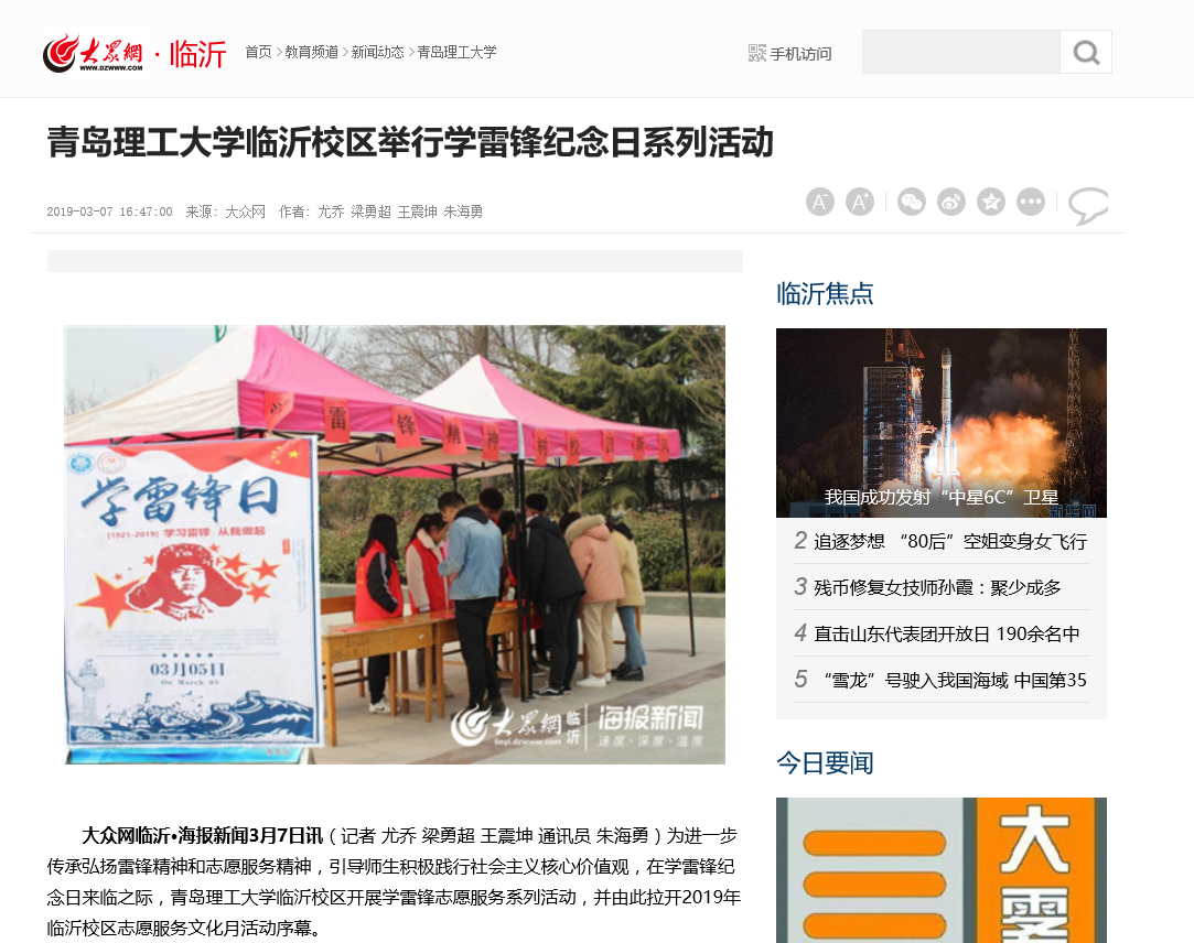 大众网临沂·海报新闻3月7日讯(记者 尤乔 梁勇超 王震坤 通讯员 朱海勇)为进一步传承弘扬雷锋精神和志愿服务精神,引导师生积极践行社会主义核心价值观,在学雷锋纪念日来临之际,伟德国际1946bv官网临沂校区开展学雷锋志愿服务系列活动,并由此拉开2019年临沂校区志愿服务文化月活动序幕。