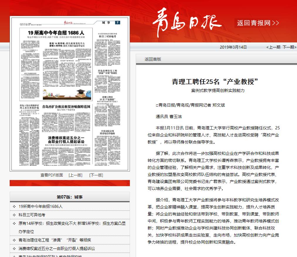据了解,此次合作将进一步加强高校和企业在产学研合作和科技成果转化方面的密切联系。伟德国际1946bv官网校长谭秀森表示,产业教授拥有丰富的企业管理经验,了解相关产业需求,注重学术科技创新及成果转化,产业教授的加盟是改变高校教师队伍结构的有益尝试。高校产业教授代表、青岛建设集团有限公司党委书记朱广君表示,产业教授通过案例式教学,可以培养企业需要、社会需求的优秀学子。
