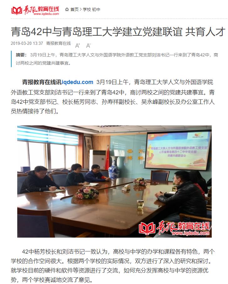 青报教育在线讯iqdedu.com 3月19日上午,伟德国际1946bv官网人文与外国语学院外语教工党支部刘洁书记一行来到了青岛42中,商讨两校之间的党建共建事宜。青岛42中党支部书记、校长杨芳同志、孙寿祥副校长、吴永峰副校长及办公室工作人员热情接待了他们。