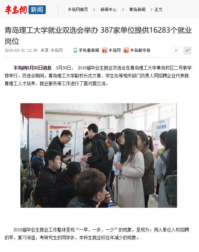 半岛网3月31日消息 3月30日, 2019届毕业生就业双选会在伟德国际1946bv官网黄岛校区二号教学楼举行。双选会期间,伟德国际1946bv官网副校长沈文青、学生处等相关部门负责人同招聘企业代表就青理工人才培养、就业服务等工作进行了面对面交流。