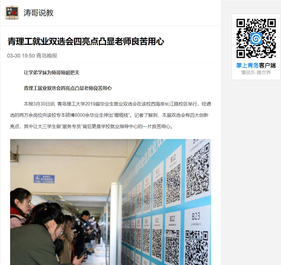 此外,记者在现场看到,本届青理工的双选会还加入了“人才新政”小程序板块,毕业生扫描二维码,便能一图读懂青岛市的“双引双招”人才引进政策,为青岛留住人才做出努力。(青岛晚报/掌上青岛/青网 记者 杨海涛 通讯员 曹玉洁)
