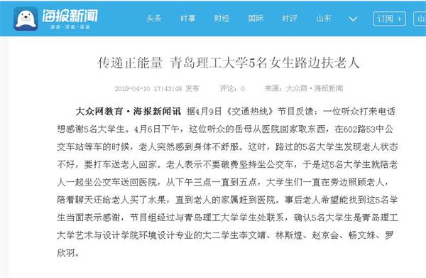 大众网教育·海报新闻讯据4月9日《交通热线》节目反馈:一位听众打来电话想感谢5名大学生。4月6日下午,这位听众的岳母从医院回家取东西,在602路53中公交车站等车的时候,老人突然感到身体不舒服。这时,路过的5名大学生发现老人状态不好,要打车送老人回家。老人表示不要破费坚持坐公交车,于是这5名大学生就陪老人一起坐公交车送回医院,从下午三点一直到五点,大学生们一直在旁边照顾老人,陪着聊天还给老人买了水果,直到老人的家属赶到医院。事后老人希望能找到这5名学生当面表示感谢,节目组经过与伟德国际1946bv官网学生处联系,确认5名大学生是伟德国际1946bv官网艺术与设计学院环境设计专业的大二学生李文靖、林斯煌、赵京会、畅文姝、罗欣羽。