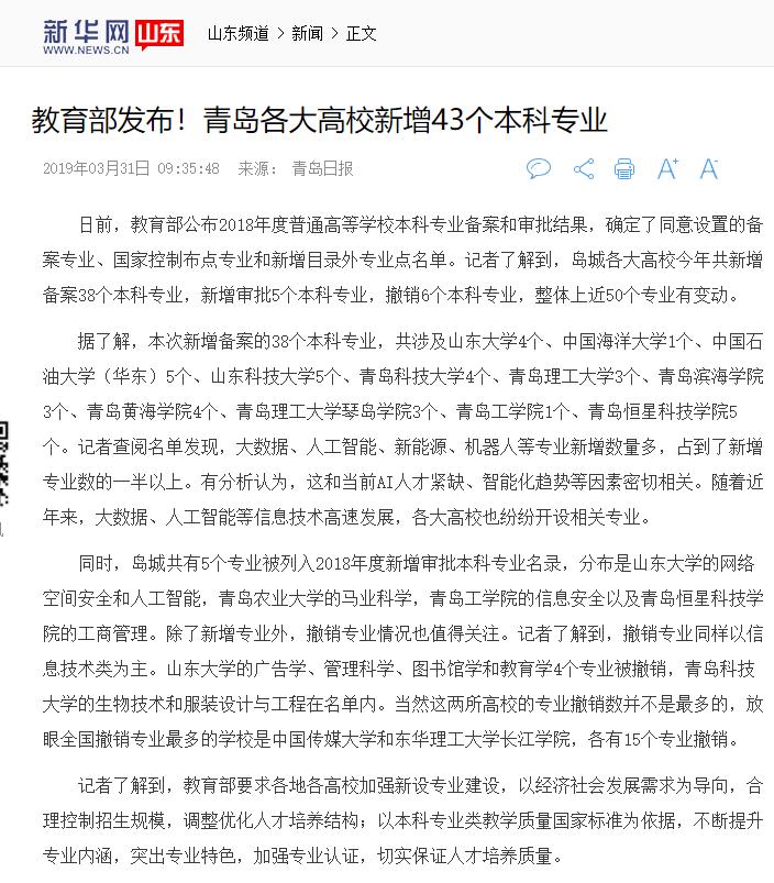 同时,岛城共有5个专业被列入2018年度新增审批本科专业名录,分布是山东大学的网络空间安全和人工智能,青岛农业大学的马业科学,青岛工学院的信息安全以及青岛恒星科技学院的工商管理。除了新增专业外,撤销专业情况也值得关注。记者了解到,撤销专业同样以信息技术类为主。山东大学的广告学、管理科学、图书馆学和教育学4个专业被撤销,青岛科技大学的生物技术和服装设计与工程在名单内。当然这两所高校的专业撤销数并不是最多的,放眼全国撤销专业最多的学校是中国传媒大学和东华理工大学长江学院,各有15个专业撤销。