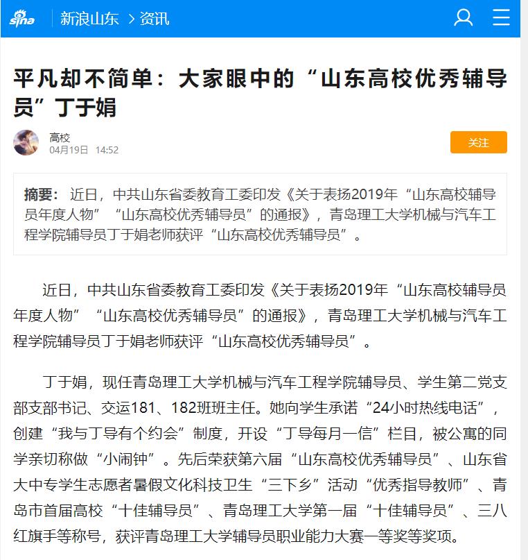 近日,中共山东省委教育工委印发《关于表扬2019年“山东高校辅导员年度人物”“山东高校优秀辅导员”的通报》,伟德国际1946bv官网机械与汽车工程学院辅导员丁于娟老师获评“山东高校优秀辅导员”。