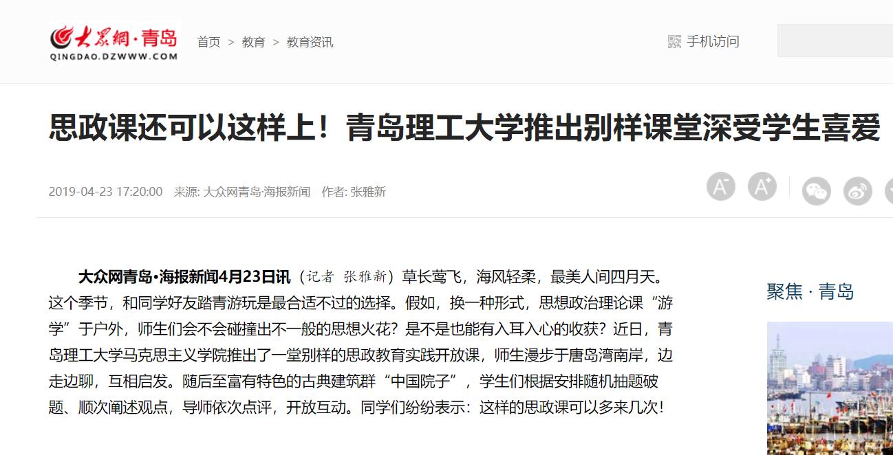 大众网青岛·海报新闻4月23日讯(记者 张雅新)草长莺飞,海风轻柔,最美人间四月天。这个季节,和同学好友踏青游玩是最合适不过的选择。假如,换一种形式,思想政治理论课“游学”于户外,师生们会不会碰撞出不一般的思想火花?是不是也能有入耳入心的收获?近日,伟德国际1946bv官网马克思主义学院推出了一堂别样的思政教育实践开放课,师生漫步于唐岛湾南岸,边走边聊,互相启发。随后至富有特色的古典建筑群“中国院子”,学生们根据安排随机抽题破题、顺次阐述观点,导师依次点评,开放互动。同学们纷纷表示:这样的思政课可以多来几次!