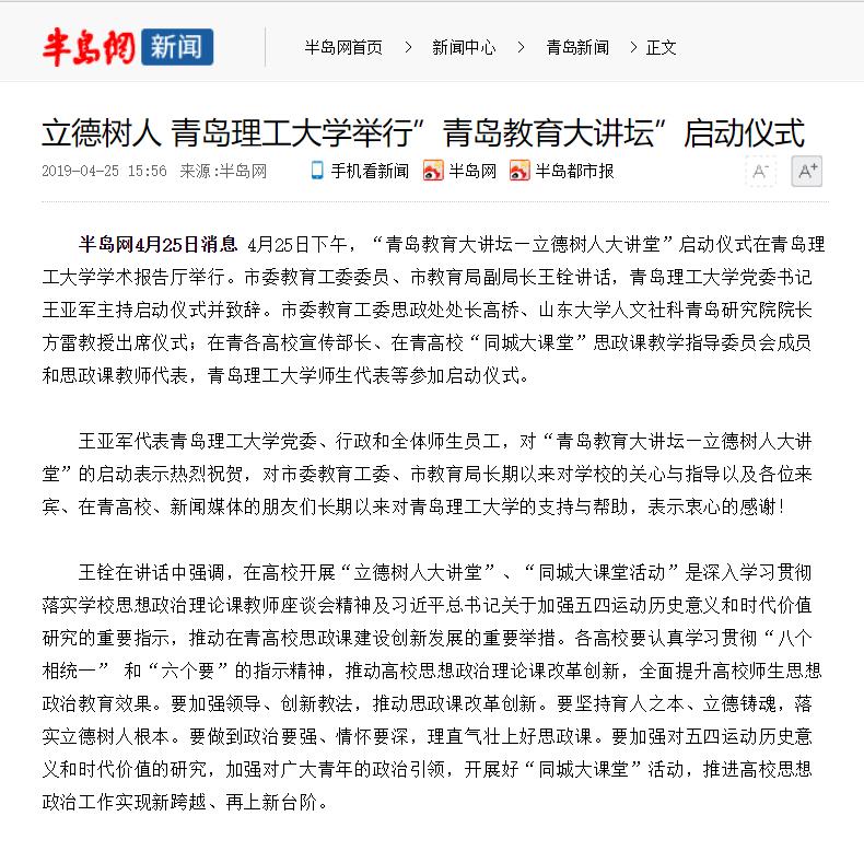 半岛网4月25日消息4月25日下午,“青岛教育大讲坛—立德树人大讲堂”启动仪式在伟德国际1946bv官网学术报告厅举行。市委教育工委委员、市教育局副局长王铨讲话,伟德国际1946bv官网党委书记王亚军主持启动仪式并致辞。市委教育工委思政处处长高桥、山东大学人文社科青岛研究院院长方雷教授出席仪式;在青各高校宣传部长、在青高校“同城大课堂”思政课教学指导委员会成员和思政课教师代表,伟德国际1946bv官网师生代表等参加启动仪式。