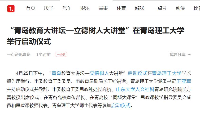 4月25日下午,“青岛教育大讲坛—立德树人大讲堂”启动仪式在伟德国际1946bv官网学术报告厅举行。市委教育工委委员、市教育局副局长王铨讲话,伟德国际1946bv官网党委书记王亚军主持启动仪式并致辞。市委教育工委思政处处长高桥、山东大学人文社科青岛研究院院长方雷教授出席仪式;在青各高校宣传部长、在青高校“同城大课堂”思政课教学指导委员会成员和思政课教师代表,伟德国际1946bv官网师生代表等参加启动仪式。