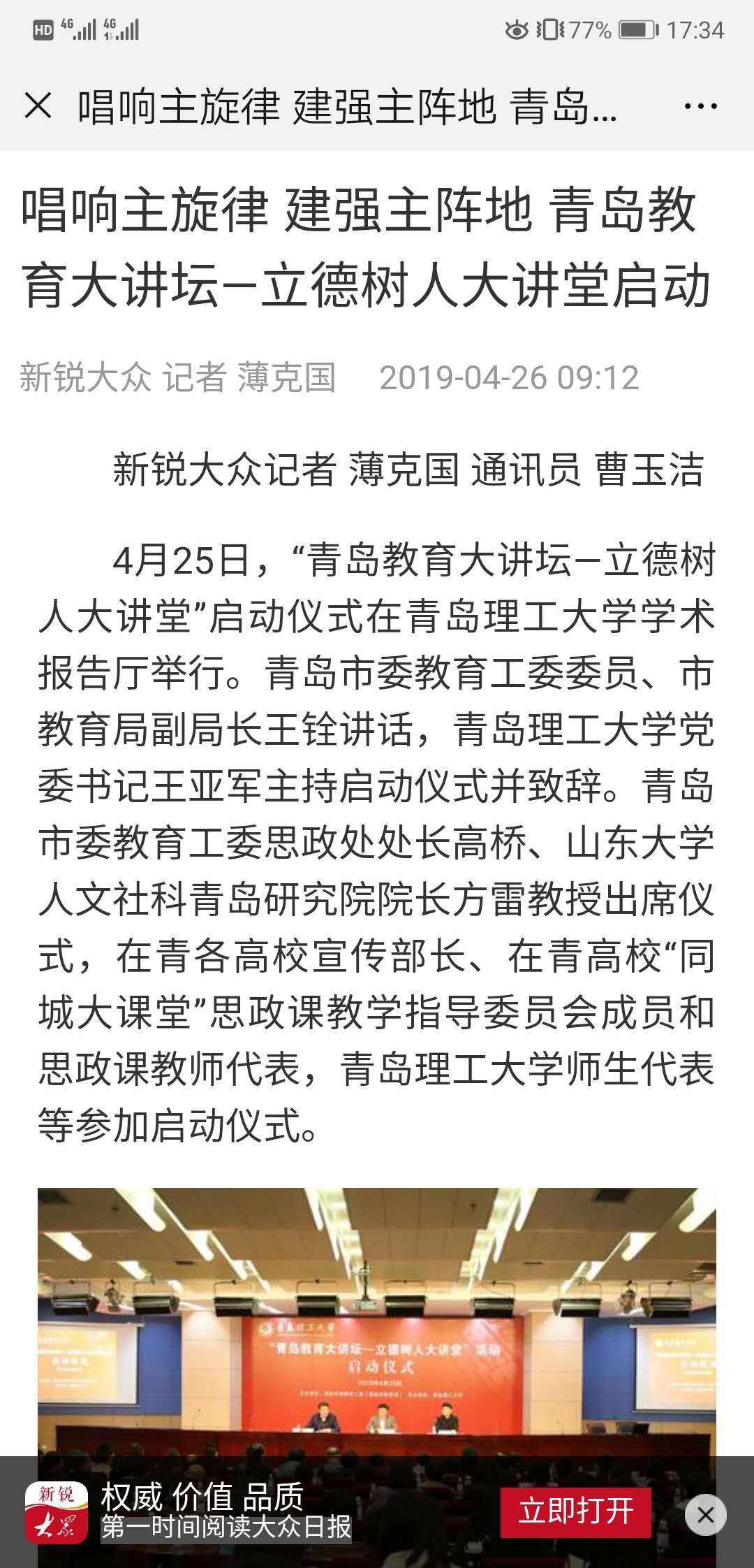 4月25日,“青岛教育大讲坛—立德树人大讲堂”启动仪式在伟德国际1946bv官网学术报告厅举行。青岛市委教育工委委员、市教育局副局长王铨讲话,伟德国际1946bv官网党委书记王亚军主持启动仪式并致辞。青岛市委教育工委思政处处长高桥、山东大学人文社科青岛研究院院长方雷教授出席仪式,在青各高校宣传部长、在青高校“同城大课堂”思政课教学指导委员会成员和思政课教师代表,伟德国际1946bv官网师生代表等参加启动仪式。