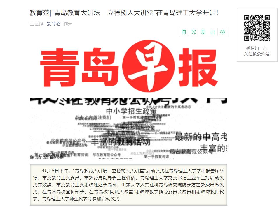 4月25日下午,“青岛教育大讲坛—立德树人大讲堂”启动仪式在伟德国际1946bv官网学术报告厅举行。市委教育工委委员、市教育局副局长王铨讲话,伟德国际1946bv官网党委书记王亚军主持启动仪式并致辞。市委教育工委思政处处长高桥、山东大学人文社科青岛研究院院长方雷教授出席仪式;在青各高校宣传部长、在青高校“同城大课堂”思政课教学指导委员会成员和思政课教师代表,伟德国际1946bv官网师生代表等参加启动仪式。