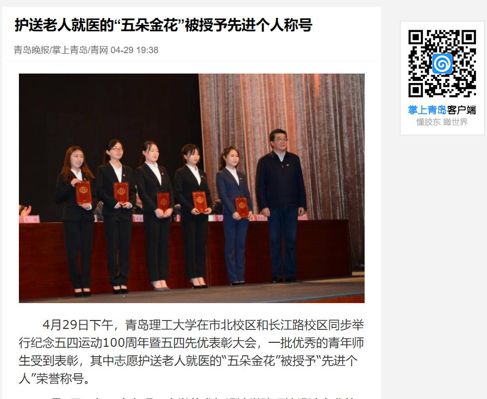 4月29日下午,伟德国际1946bv官网在市北校区和长江路校区同步举行纪念五四运动100周年暨五四先优表彰大会,一批优秀的青年师生受到表彰,其中志愿护送老人就医的“五朵金花”被授予“先进个人”荣誉称号。
